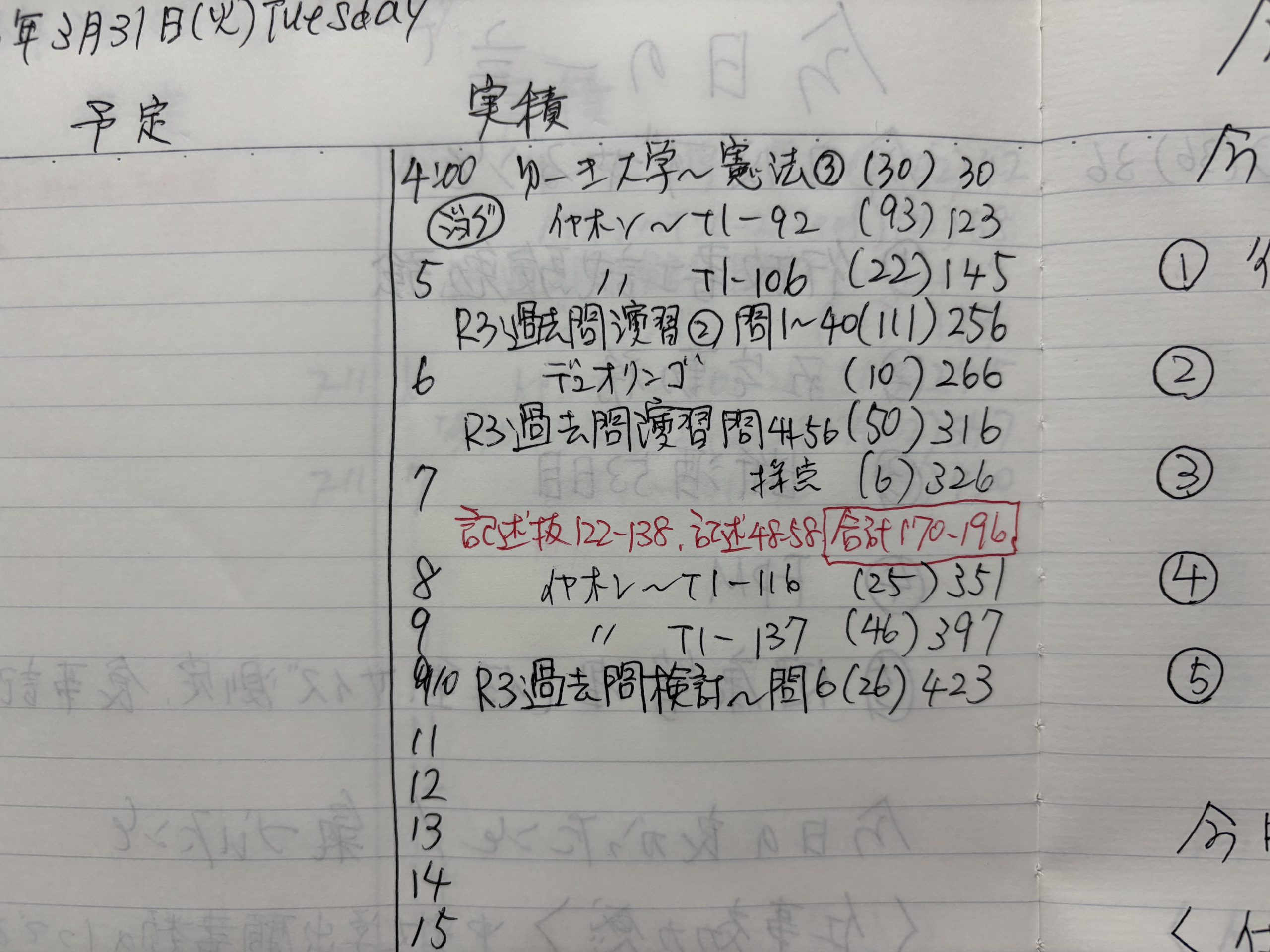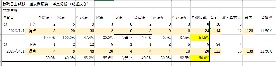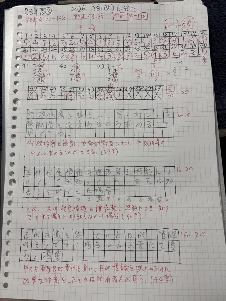 1回目と比べて得点数自体は上がっているのだが、1回目で全問正解した5肢択一の基礎法学・憲法で、7問中4問失点するなど、2周目ならではの課題も見つかった(素直に判例知識を当てはめればよいところ、変に勘ぐって失点した。)。