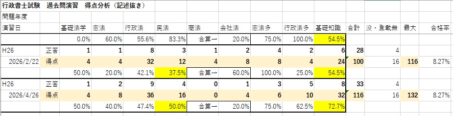 H26の合格率8.27%なので、普通に難しい問題なのだと思う。が、5肢択一の行政法9/19(47.4%)は、まずい。けどまあ、前回(2/22)の時よりは総じて得点上がっているので、勉強を継続している自分を褒めつつ、引き続き頑張りたい。押忍